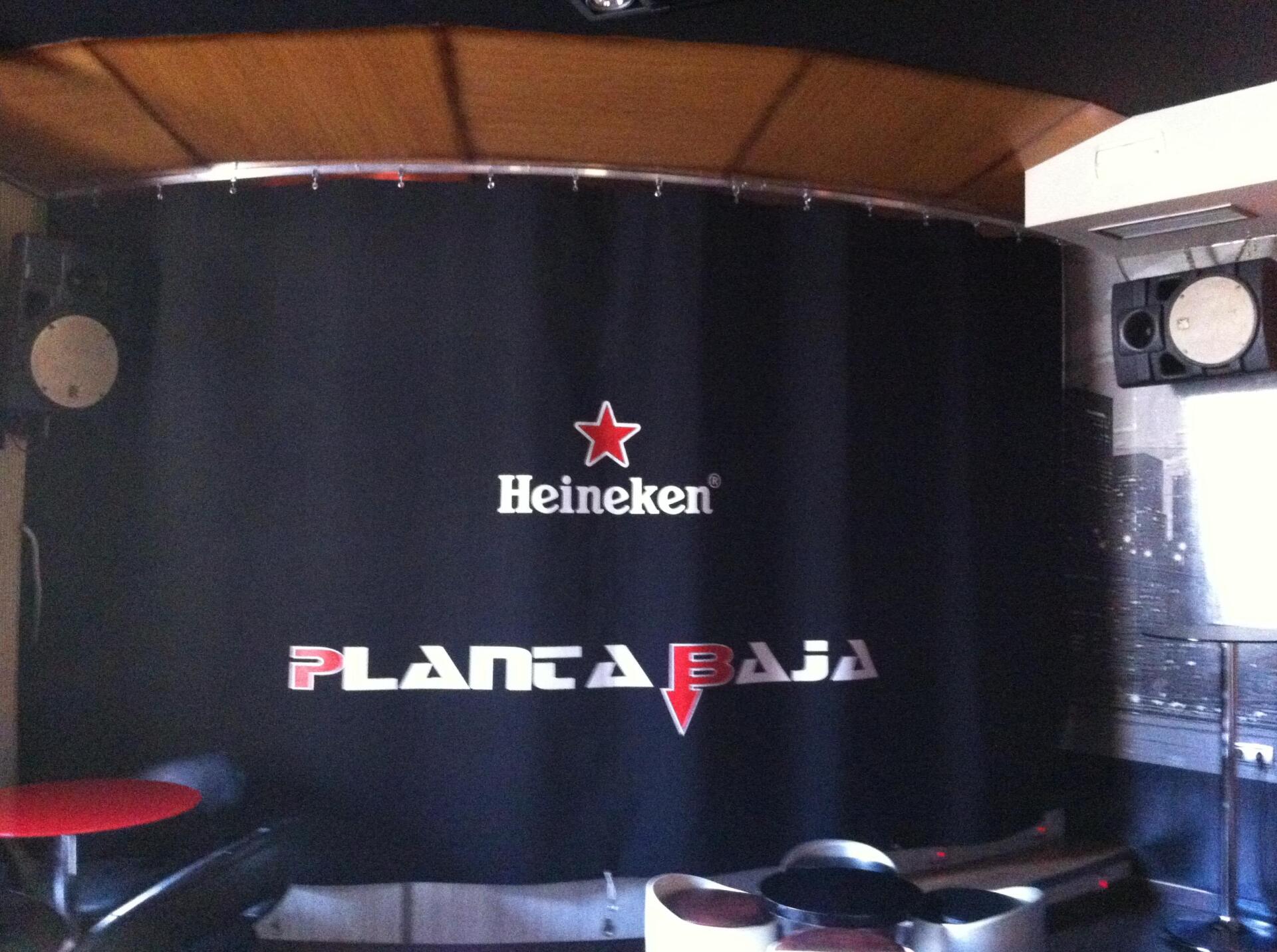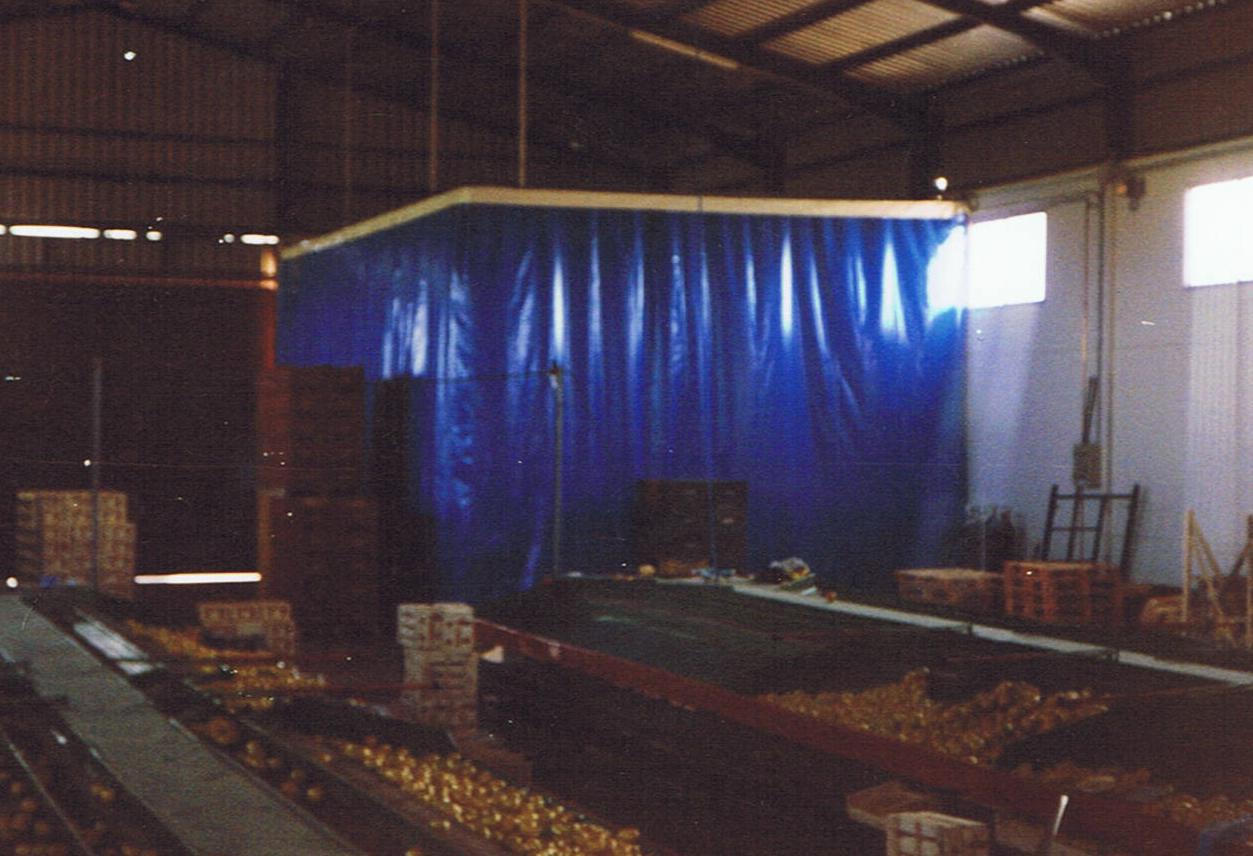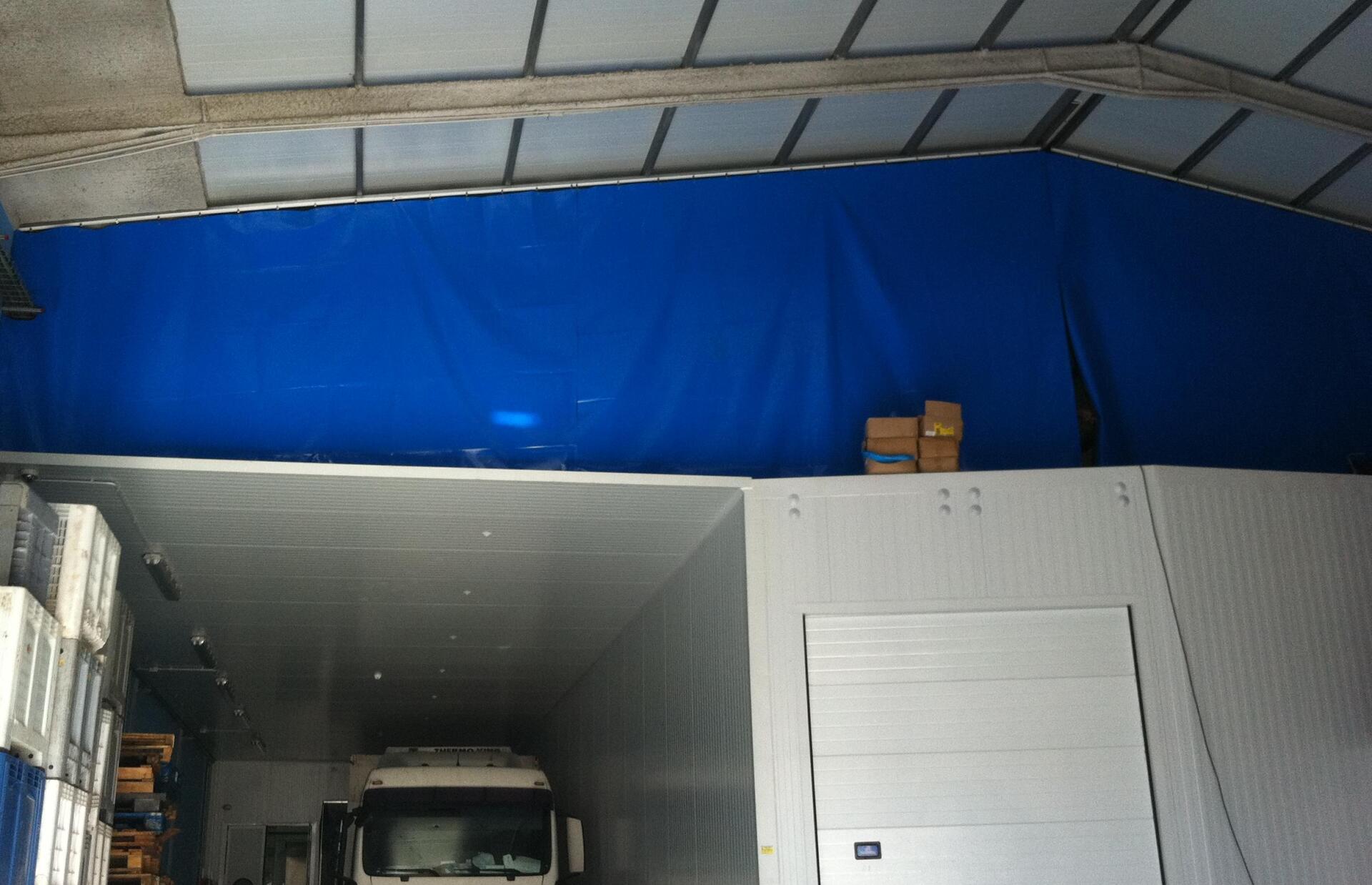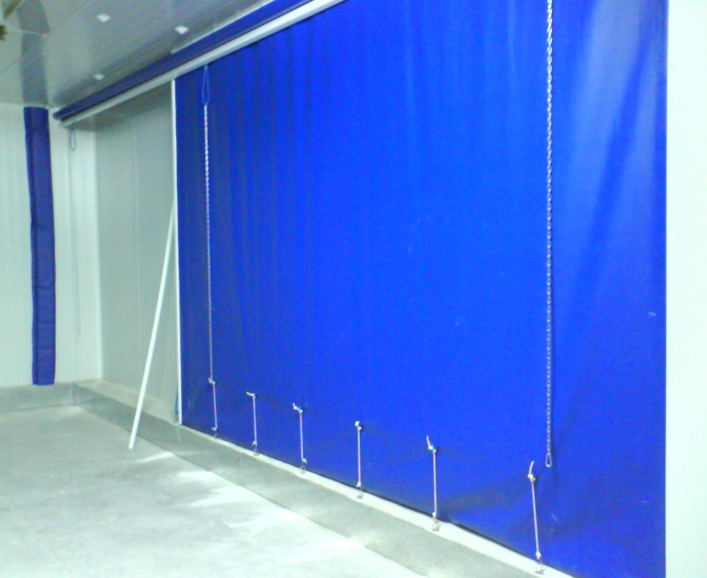 Cortina con riel y poleas sujeta al techo y plegable manual, con velcro, en los dos laterales y caída recta con terminales tensadores de ese y cuerda elástica enganchado al suelo con anilla abatible. Tira superior de protección de hueco entre techo y cortina y tira de principio y final para sujeción a pared.