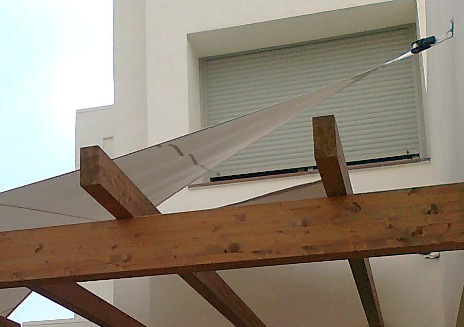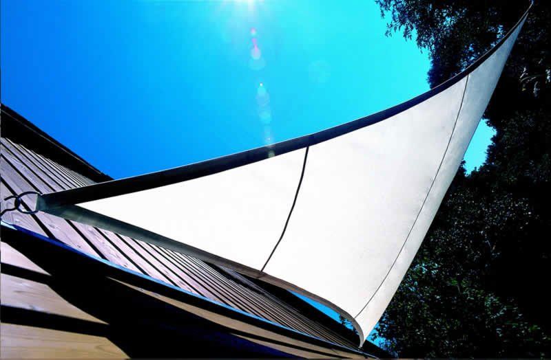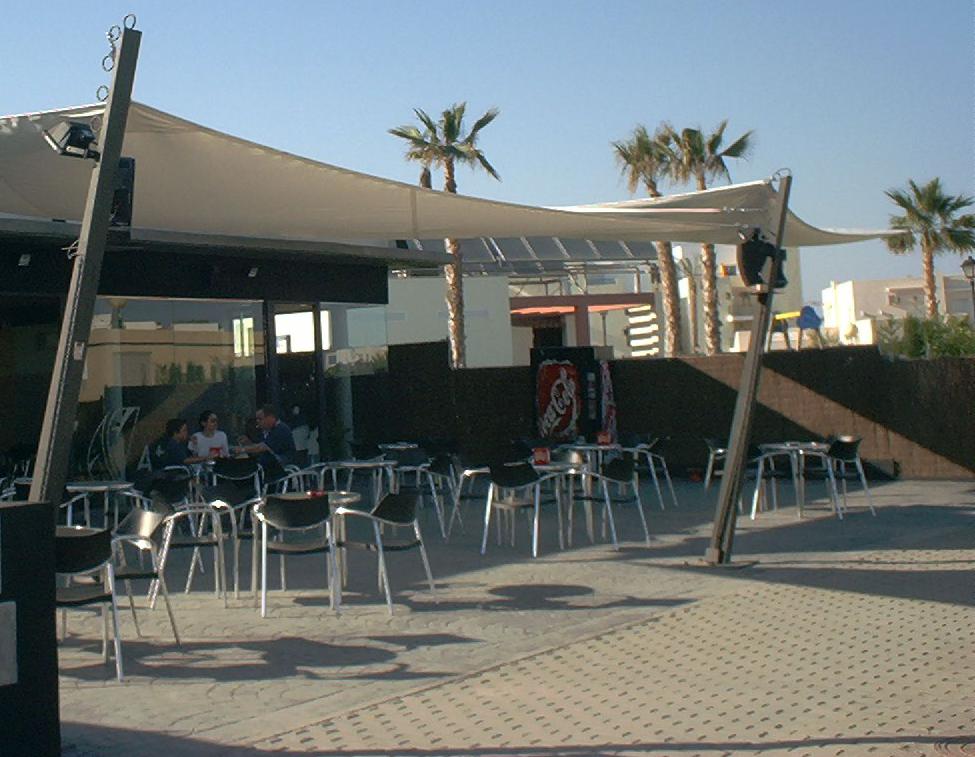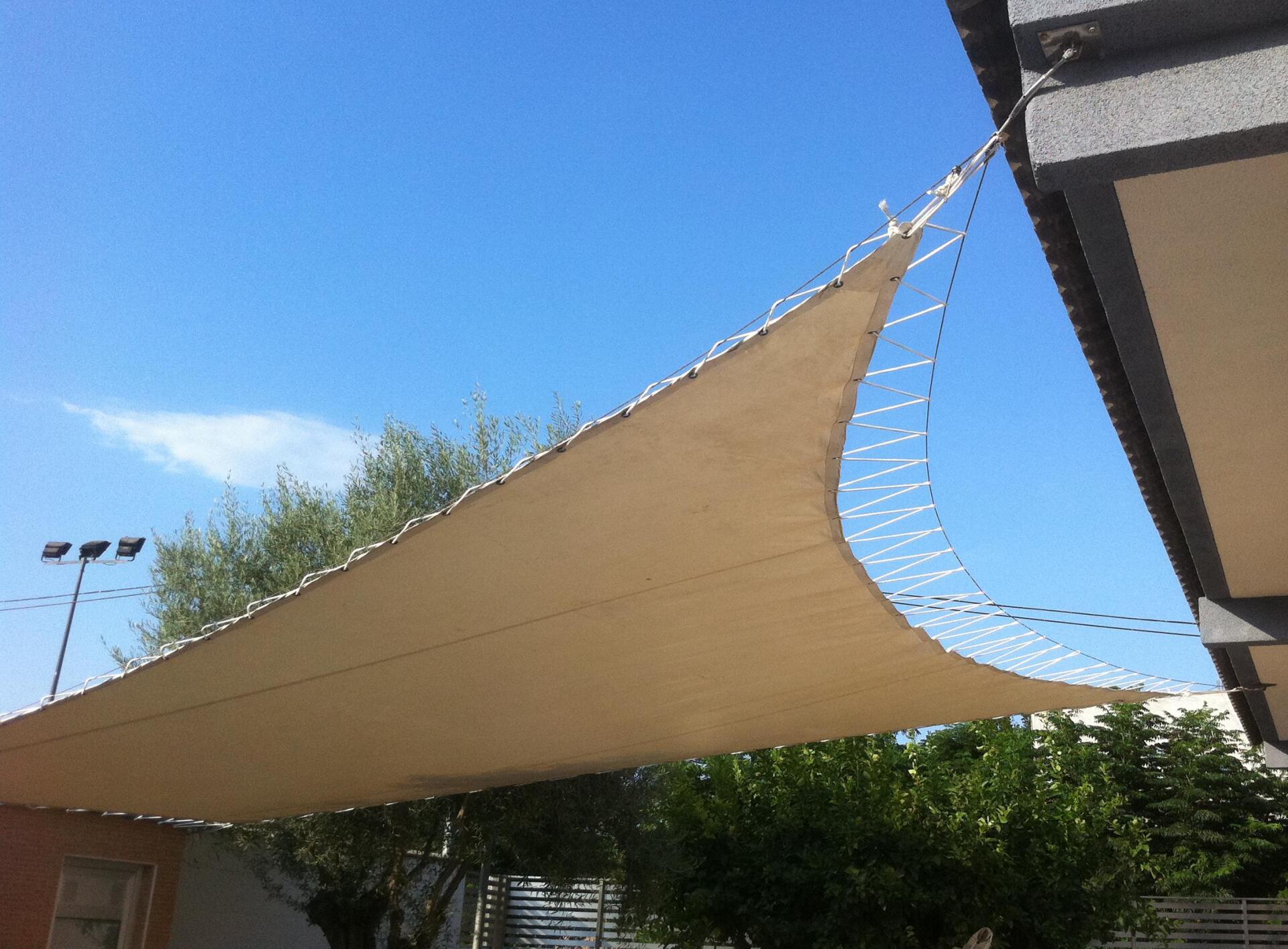 Lona Tensada fija confeccionada con lona plastificada, con costuras soldadas y cable de acero por todo el perímetro de la misma. Las esquinas de la vela están reforzadas y soldadas con la misma lona mas refuerzo metálico inoxidable.