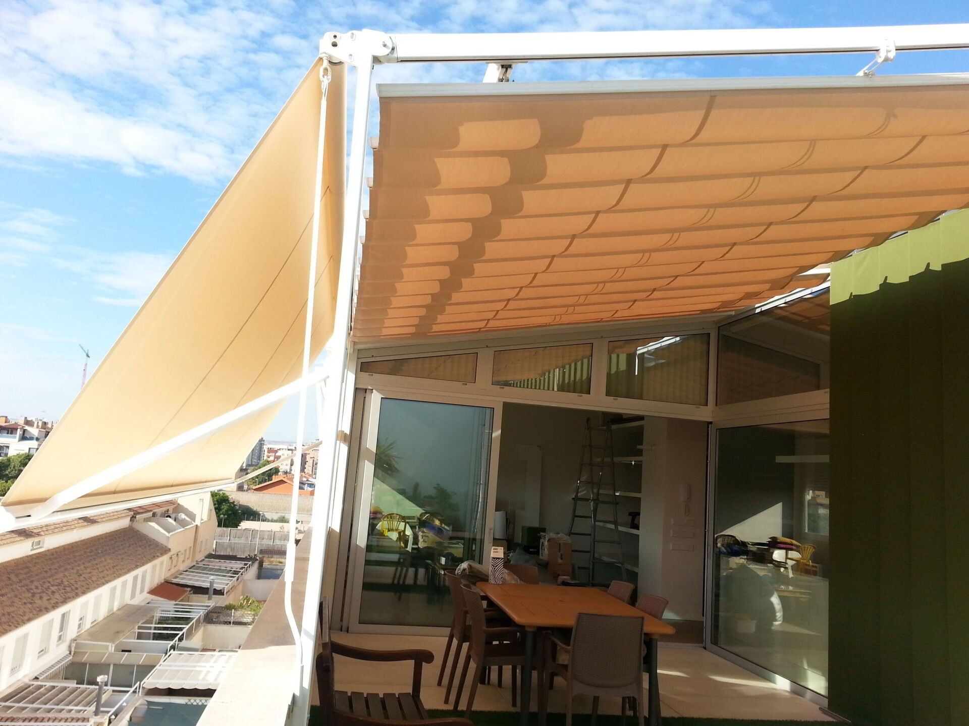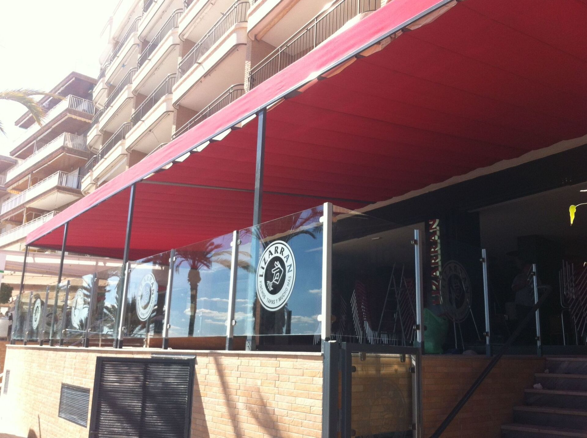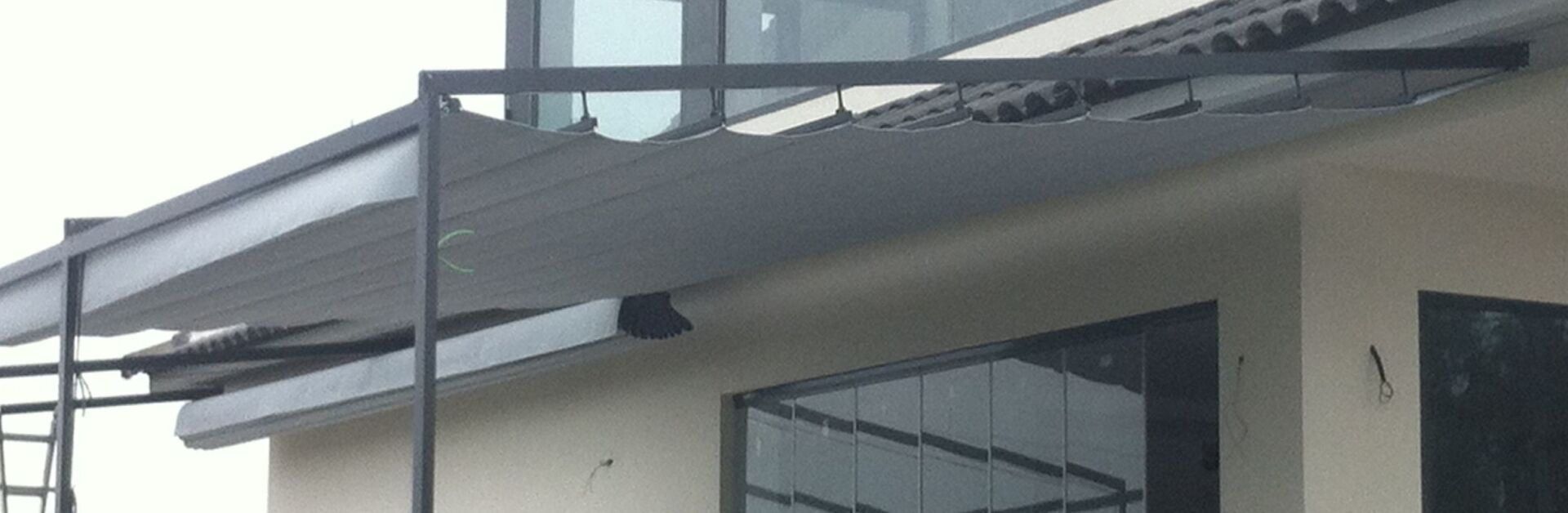 Toldo corredero a guías con sistema de guías laterales palillera para suspender la lona, sistema de cuerdas con poleas y atacuerdas para plegar y desplegar el toldo.