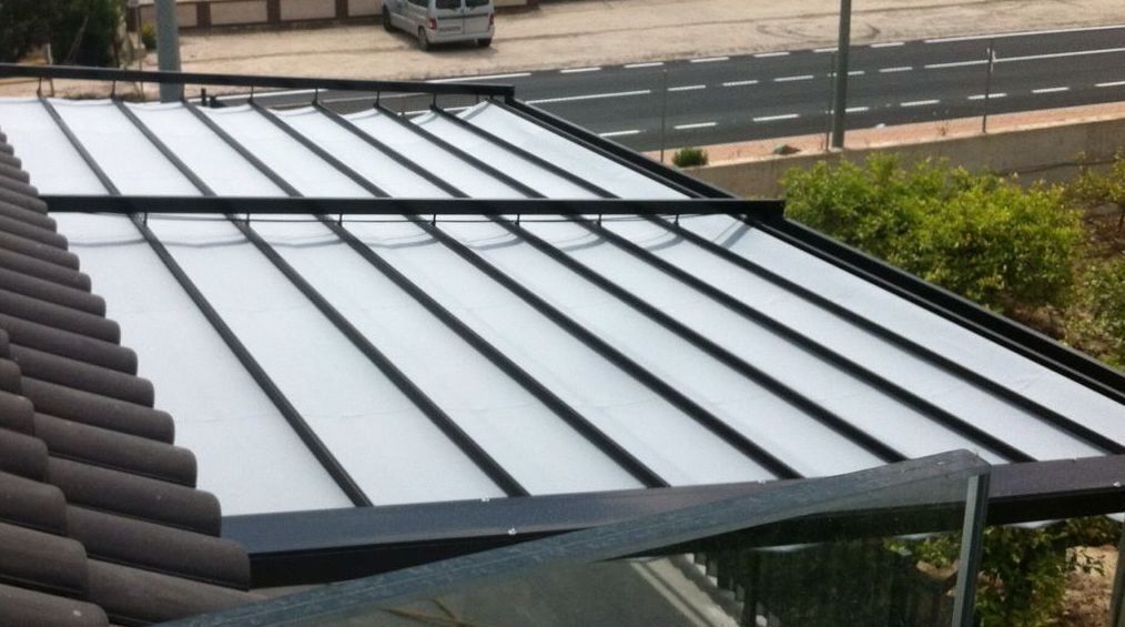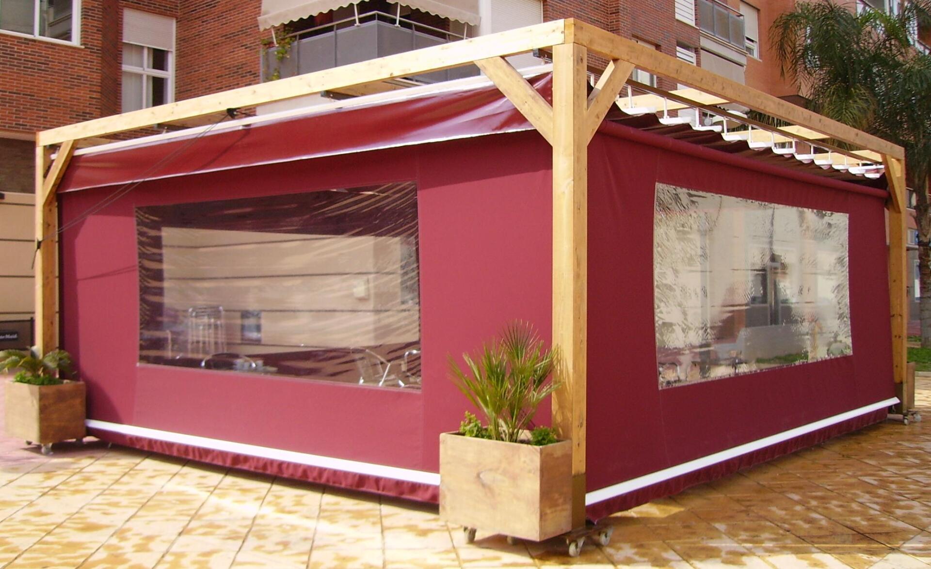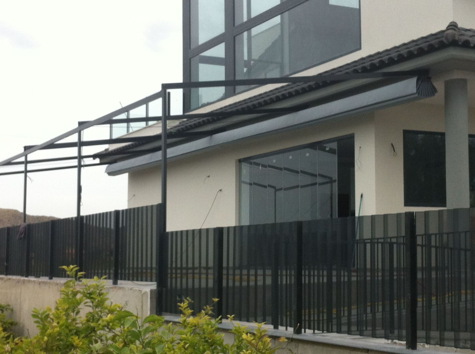 Toldo corredero a guías con sistema de guías laterales palillera para suspender la lona, sistema de cuerdas con poleas y atacuerdas para plegar y desplegar el toldo.