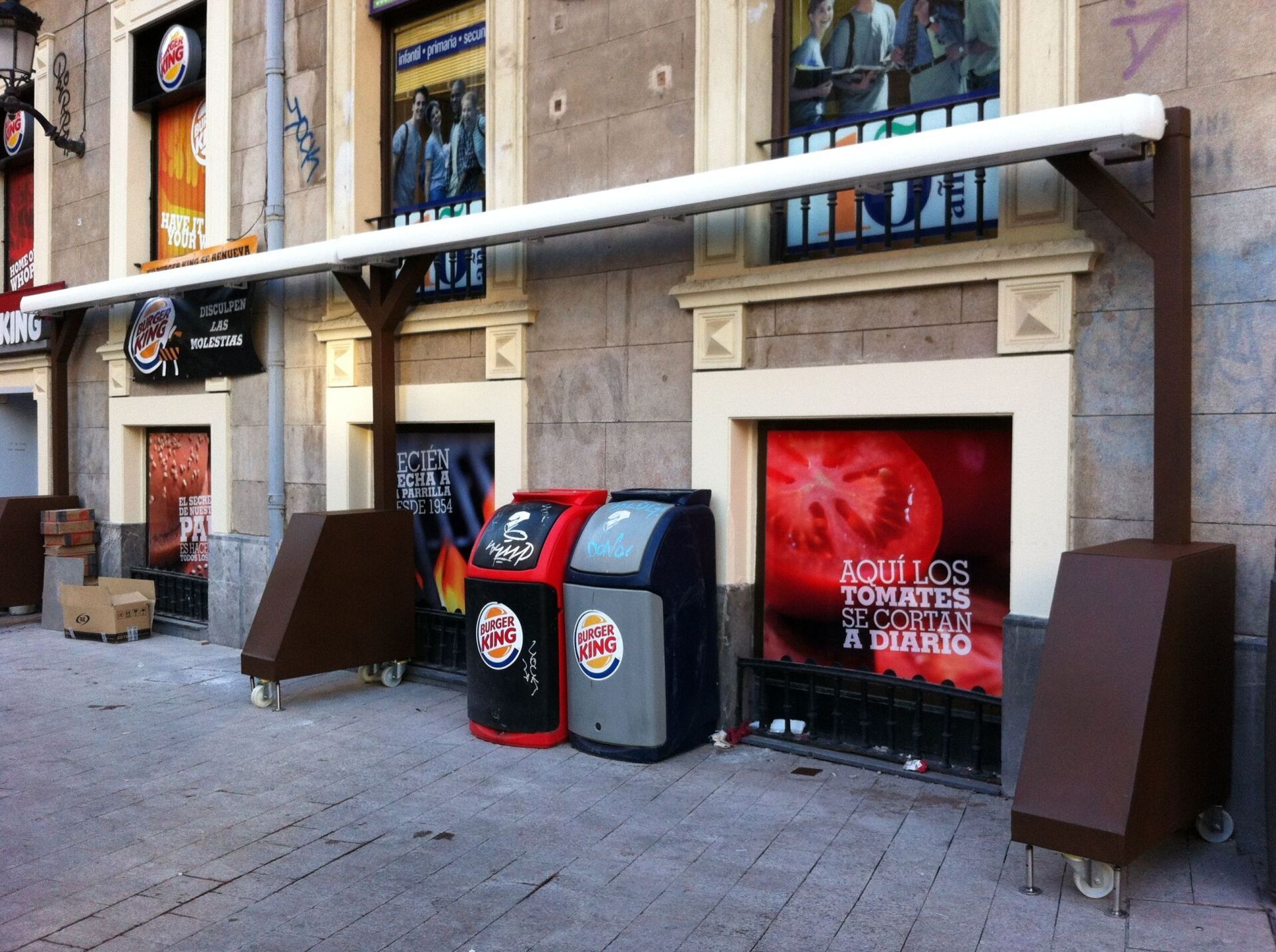 Toldo móvil corredero con cuatro columnas hasta el suelo y ruedas para poderlo mover.